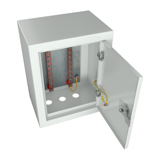 — Медные шины 2 шт. располагаются вертикально, параллельно друг другу, соединены медной перемычкой, и установлены на оцинкованную монтажную панель через изоляторы SM-25;