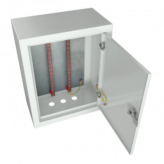 — Медные шины 2 шт. располагаются вертикально, параллельно друг другу, соединены медной перемычкой, и установлены на оцинкованную монтажную панель через изоляторы SM-25;