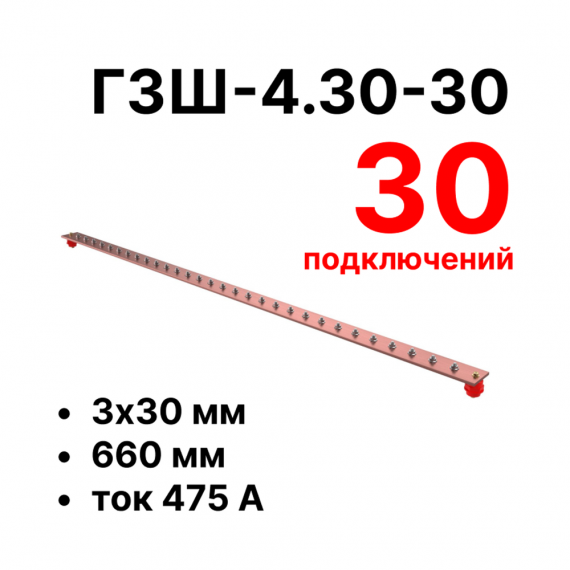 — Главная шина заземления медная 4x30 мм, 30 подключений, 460 мм, ток 475 А;