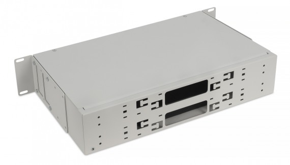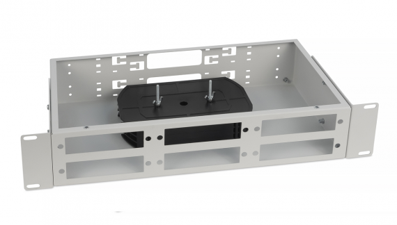 Представляет собой металлический бокс высотой 2U со съемной крышкой и сменными адаптерными панелями. Предназначен для установки в стандартные телекоммуникационные шкафы и стойки формата 19”