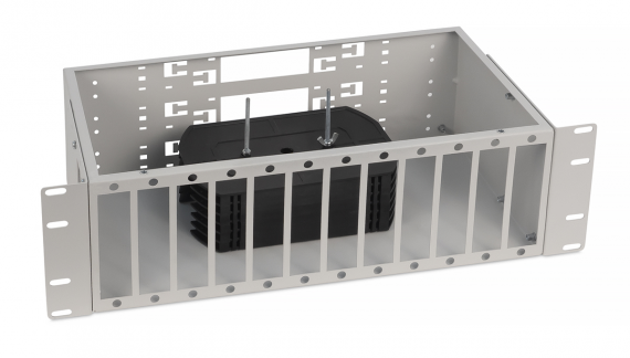 Представляет собой металлический бокс высотой 3U со съемной крышкой и сменными адаптерными панелями. Предназначен для установки в стандартные телекоммуникационные шкафы и стойки формата 19”.