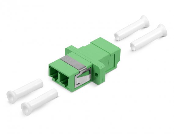 Корпус оптического адаптера выполнен из пластика. Адаптер зеленого цвета предназначен для соединения коннекторов с полировкой АРС. Крепление адаптера в оптических кроссах осуществляется с помощью металлических защелок и винтов.