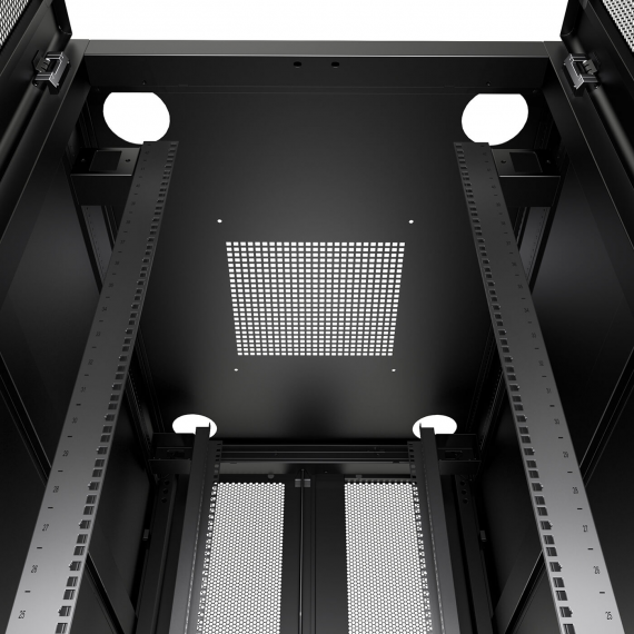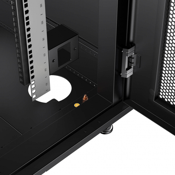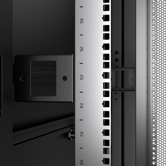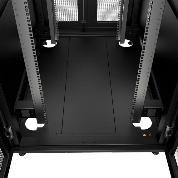 - Шкаф комплектуется передними и задними двустворчатыми дверями с ригельным замком и съемными боковыми панелями. Передние и задние двери металлические с перфорацией.