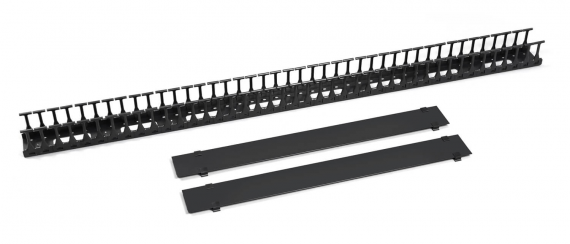 Поддерживающие элементы изготовлены из пластика и имеют торцевые ограничители, препятствующие выпадению проложенных кабелей. Скругленная поверхность «пальцев» предохраняет оболочку кабелей от повреждений и обеспечивает требуемый радиус изгиба. Передняя часть органайзера оборудована откидывающейся пластмассовой крышкой, фиксирующейся на защелках.